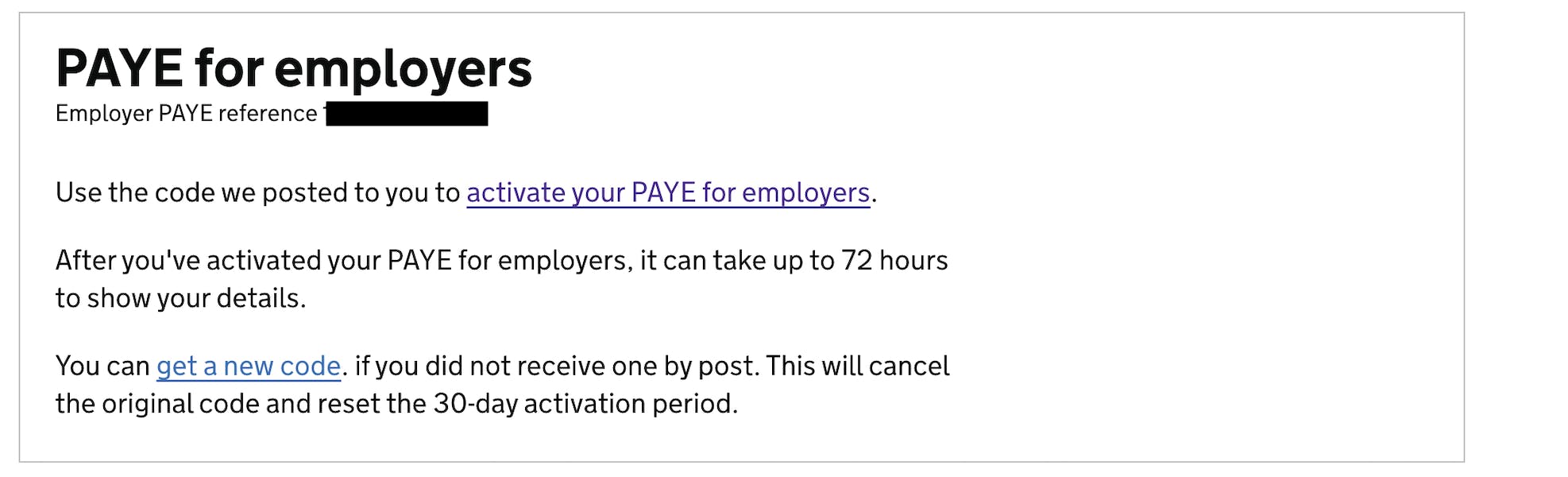 After submitting your application for PAYE, alongside your PAYE & Accounts Office reference numbers, you’ll also receive an activation code from HMRC through the post. To input this code, navigate to this link. In the portal, select 'Activate your PAYE for employers'.